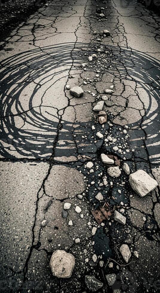 Abstract textured asphalt surface with circular patterns and scattered rocks creating a unique urban landscape Pro Photo