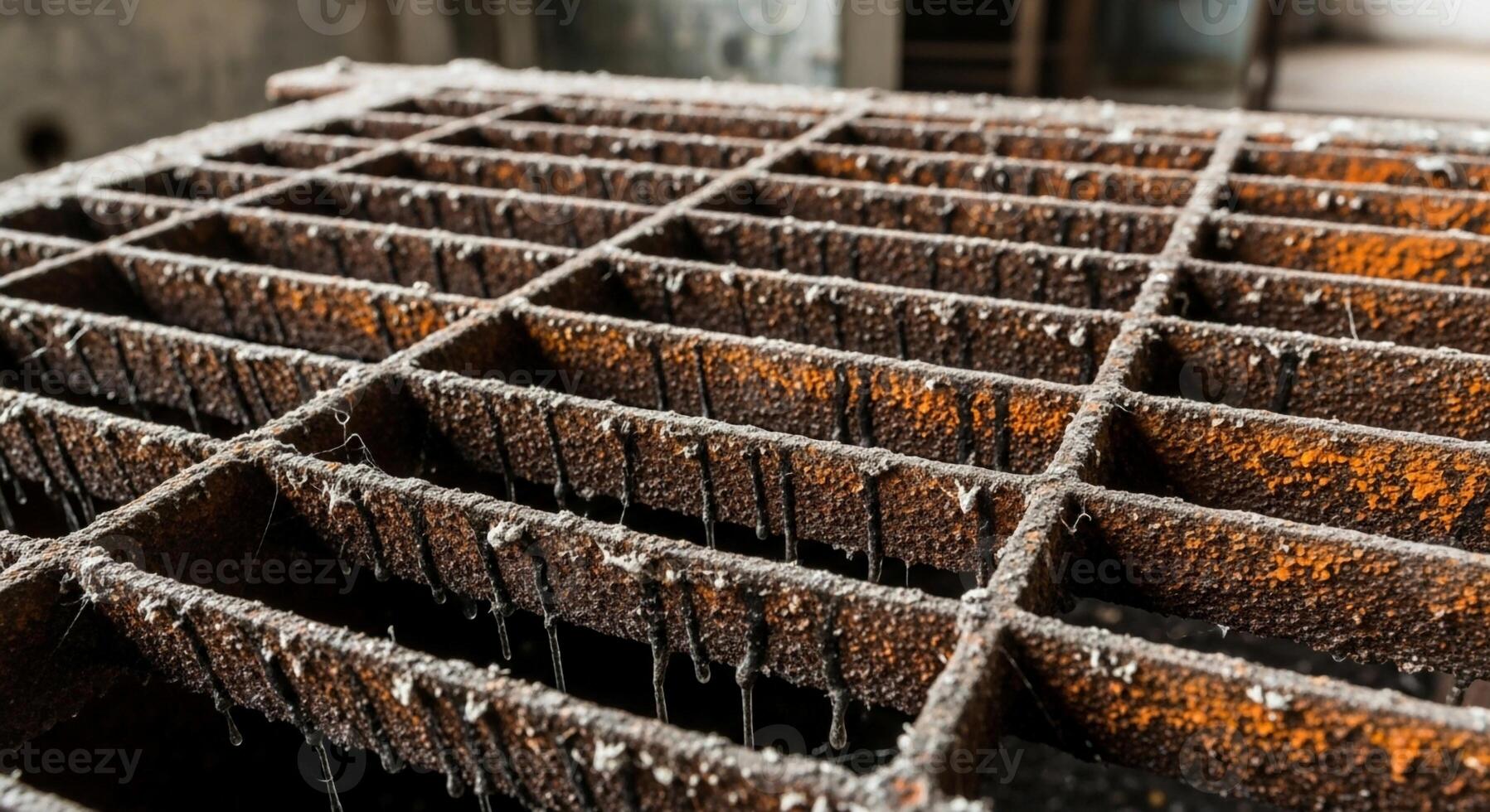 Close up view of a weathered and rusty metal grate with a grid pattern showing signs of age and industrial use Pro Photo