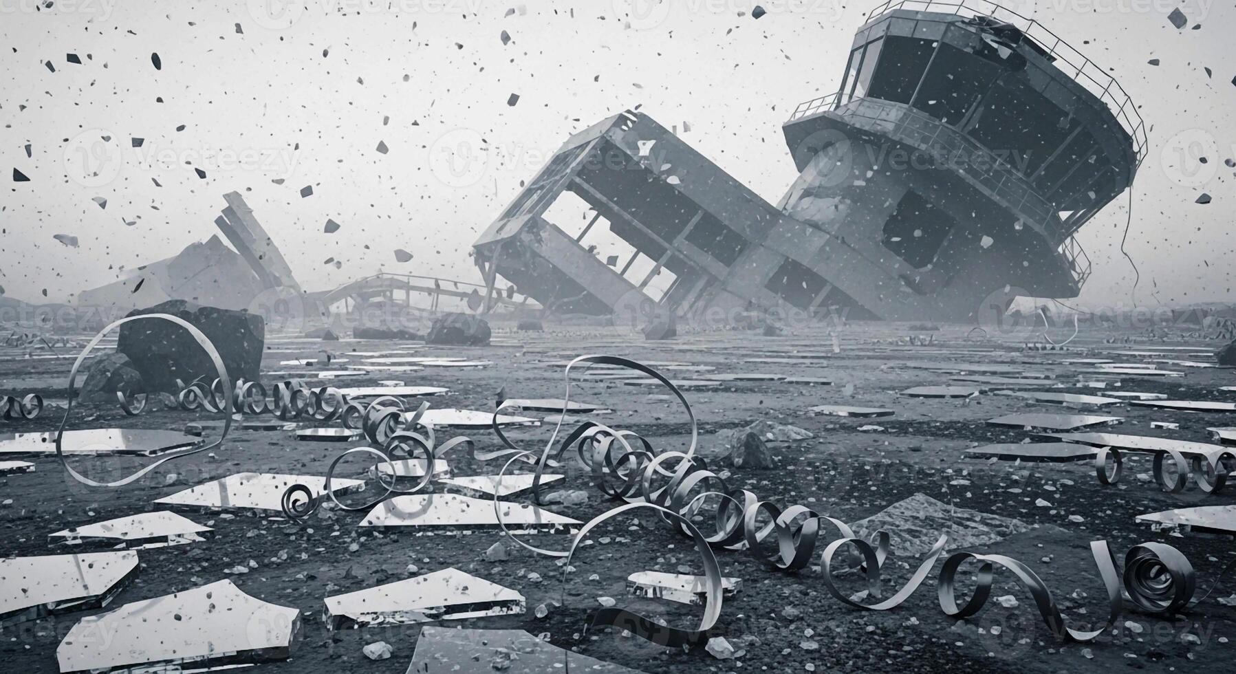 Post apocalyptic landscape with colossal wrecked structures and debris scattered across a desolate grey and misty environment Pro Photo