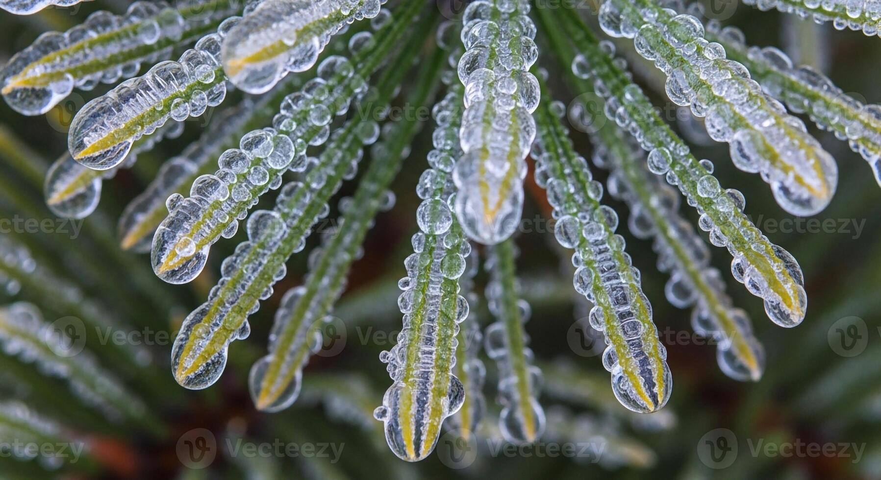 Close up macro view of delicate ice crystals forming on the needles of a coniferous evergreen tree branch after a winter frost Pro Photo