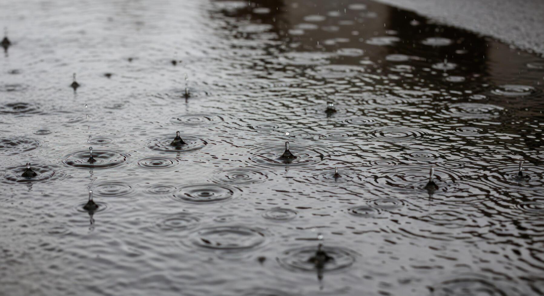 Dynamic Raindrops Creating Concentric Ripples on a Dark, Reflective Wet Surface, Capturing a Serene Moment. photo