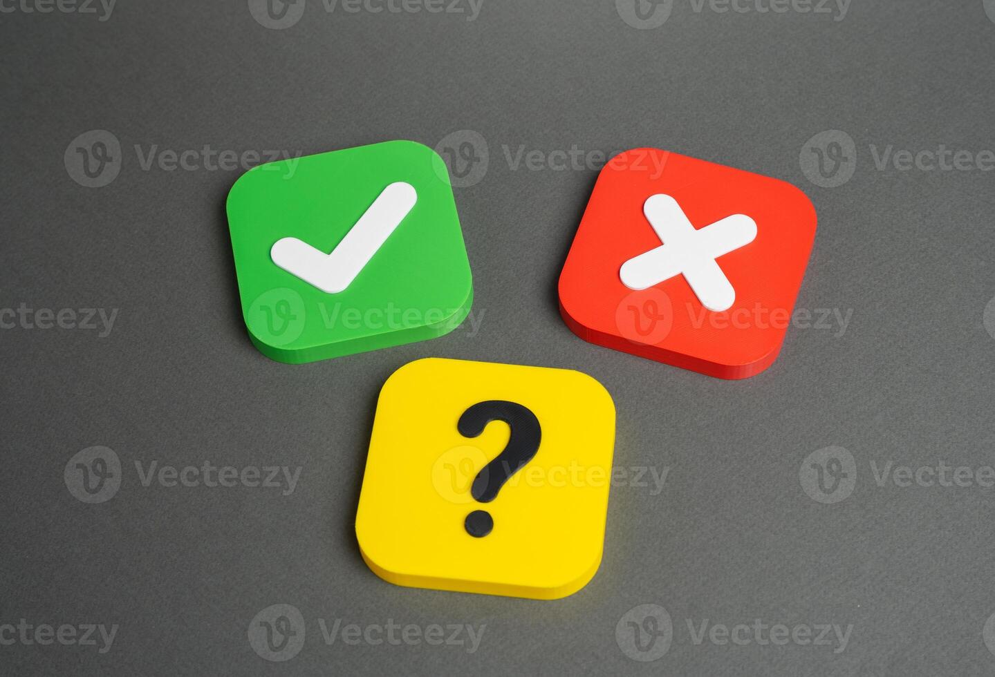 A yes no question. Green checkbox or red X. Solving a problem, making a decision, and evaluating feedback. Marketing, analytics, and social research. Surveys and statistics collection. Pro Photo