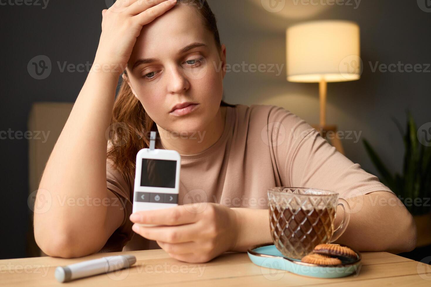 A person sits at a table, looking concerned while monitoring blood sugar levels with a glucometer. Nearby, a cup of tea and cookies lie, creating a cozy ambiance for reflection Pro Photo