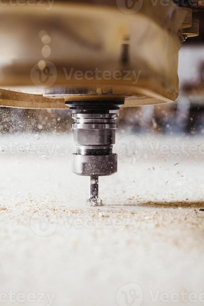Machine tool in wood factory with drilling cnc machines. Computer numerical control. Pro Photo