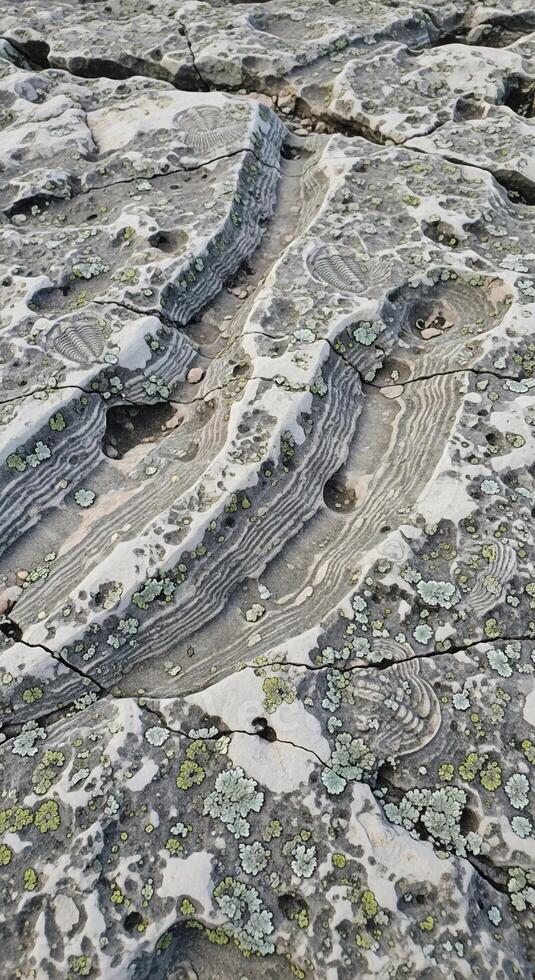 Close up view of weathered rock formations displaying intricate patterns of mineral veins and layered geological strata Pro Photo