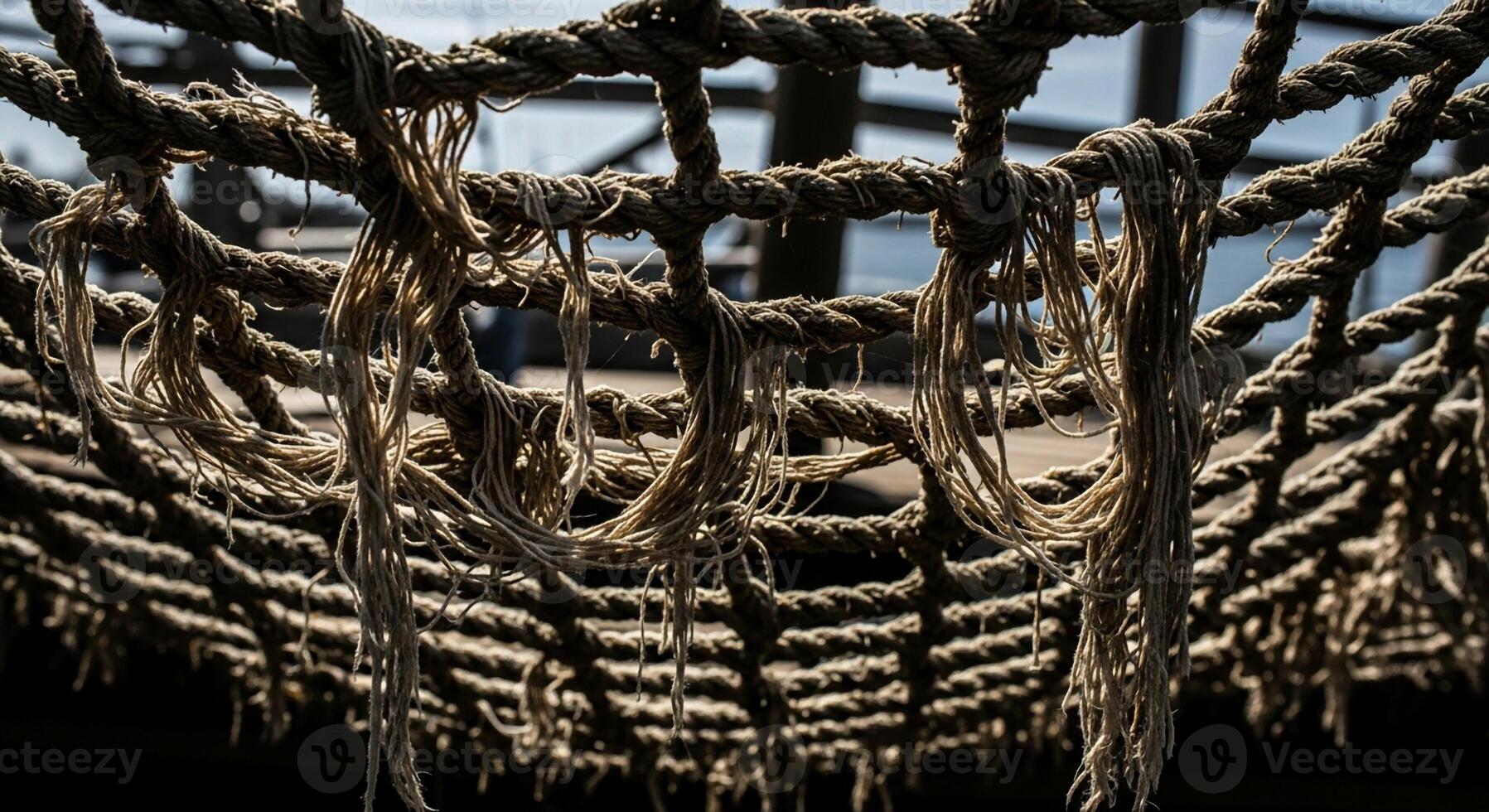 Close up view of a weathered and worn rope net with frayed strands hanging down suggesting age and use Pro Photo