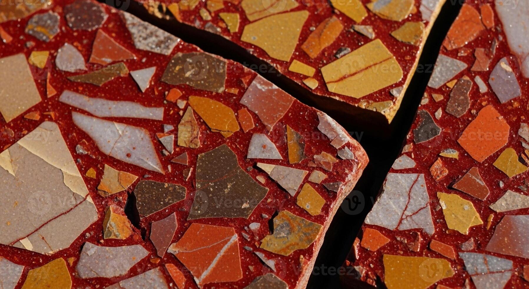 Abstract mosaic art featuring a vibrant red background with scattered shards of yellow orange and white creating a textured and dynamic composition Pro Photo