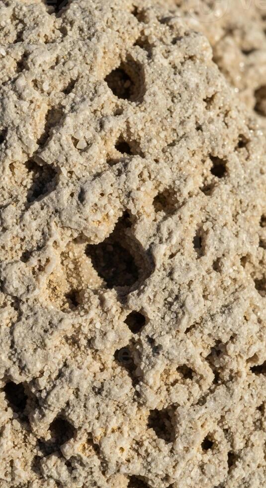 Close up view of a rough textured rock surface showing granular composition and dark mineral inclusions creating a natural abstract pattern Pro Photo