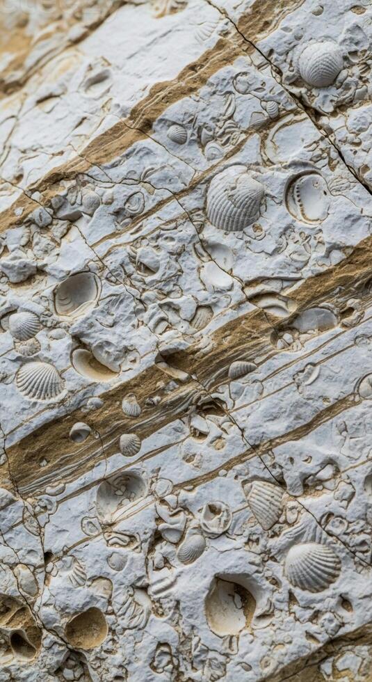 Close up view of ancient fossilized shells embedded in a textured layered rock formation showing intricate details of marine life Pro Photo