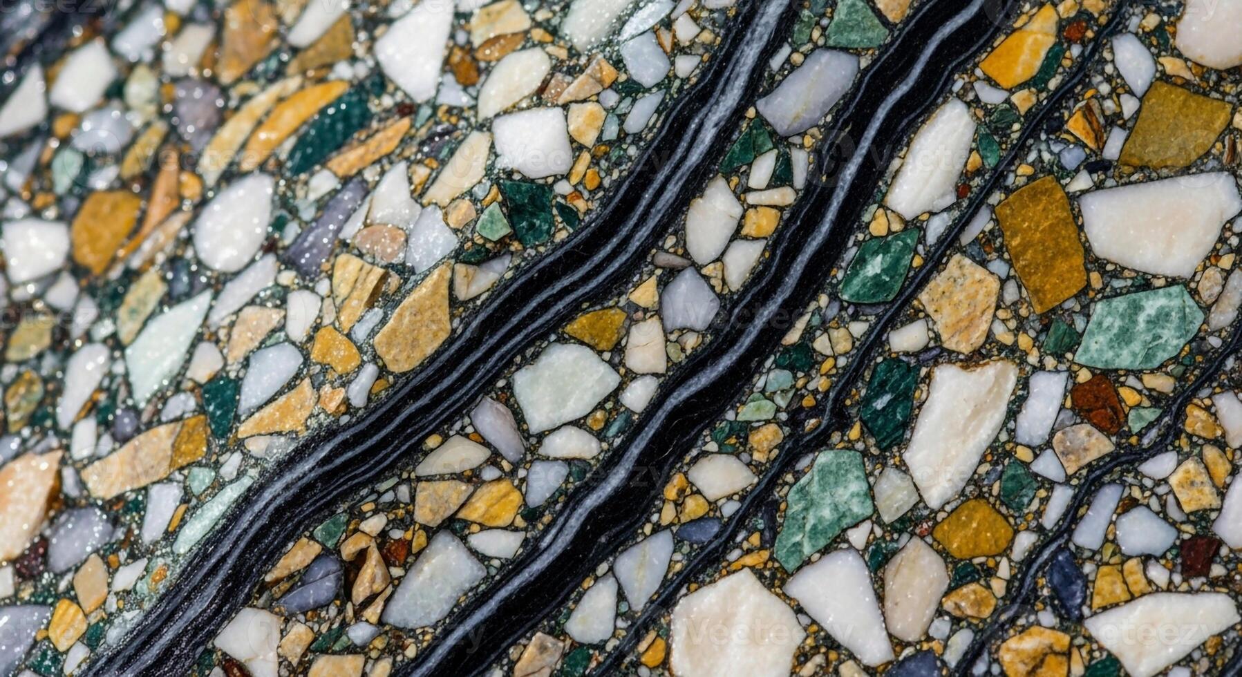 Close up view of a mosaic pattern with irregular colorful stones and dark wavy lines creating a textured abstract background Pro Photo