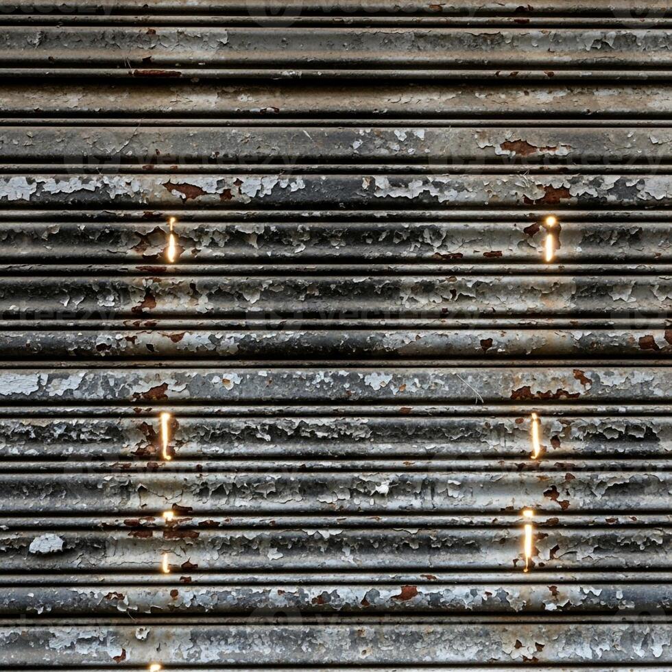 Grungy weathered corrugated metal security shutter with visible rust and peeling paint creating a textured abstract background Pro Photo