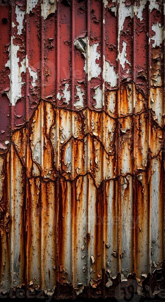 Close up of weathered corrugated metal with peeling red paint and extensive rust streaks creating a textured abstract pattern Pro Photo