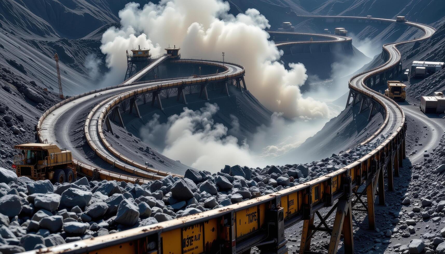 A high speed conveyor belt winds through a mining plant, moving chunks of coal with dust clouds rising and machinery operating nearby. photo