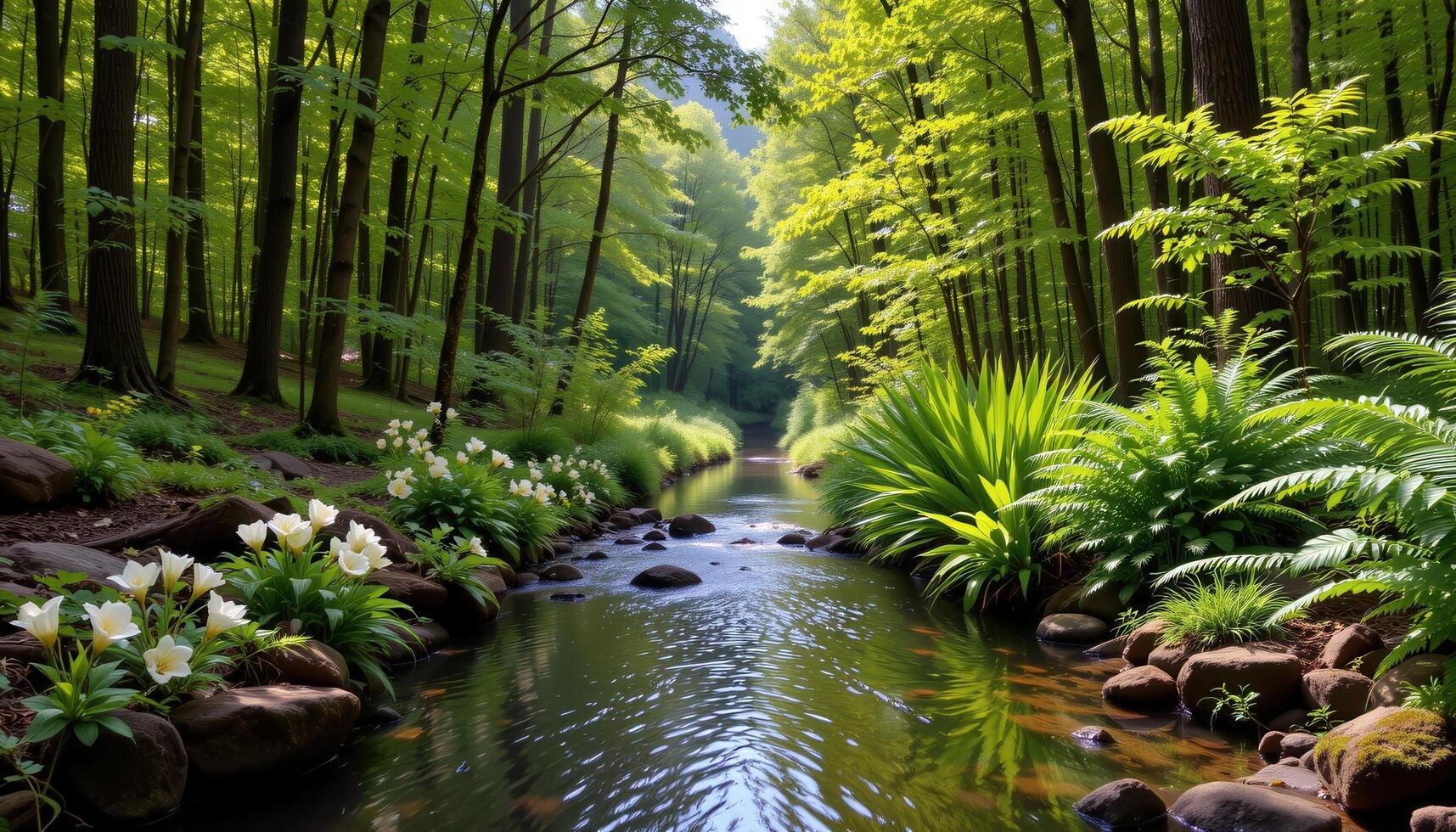 A calm stream runs gently through a forest of tall green trees, the banks alive with flowering plants and ferns swaying in the breeze. photo