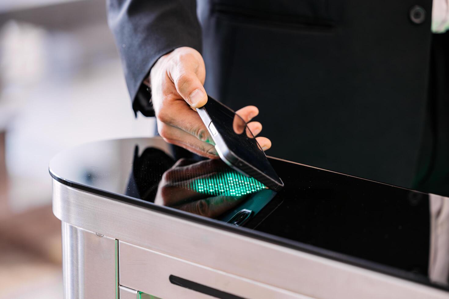 Businessman using smartphone to access secure entry system, demonstrating modern technology and convenience in urban environment with sleek design and innovative features photo