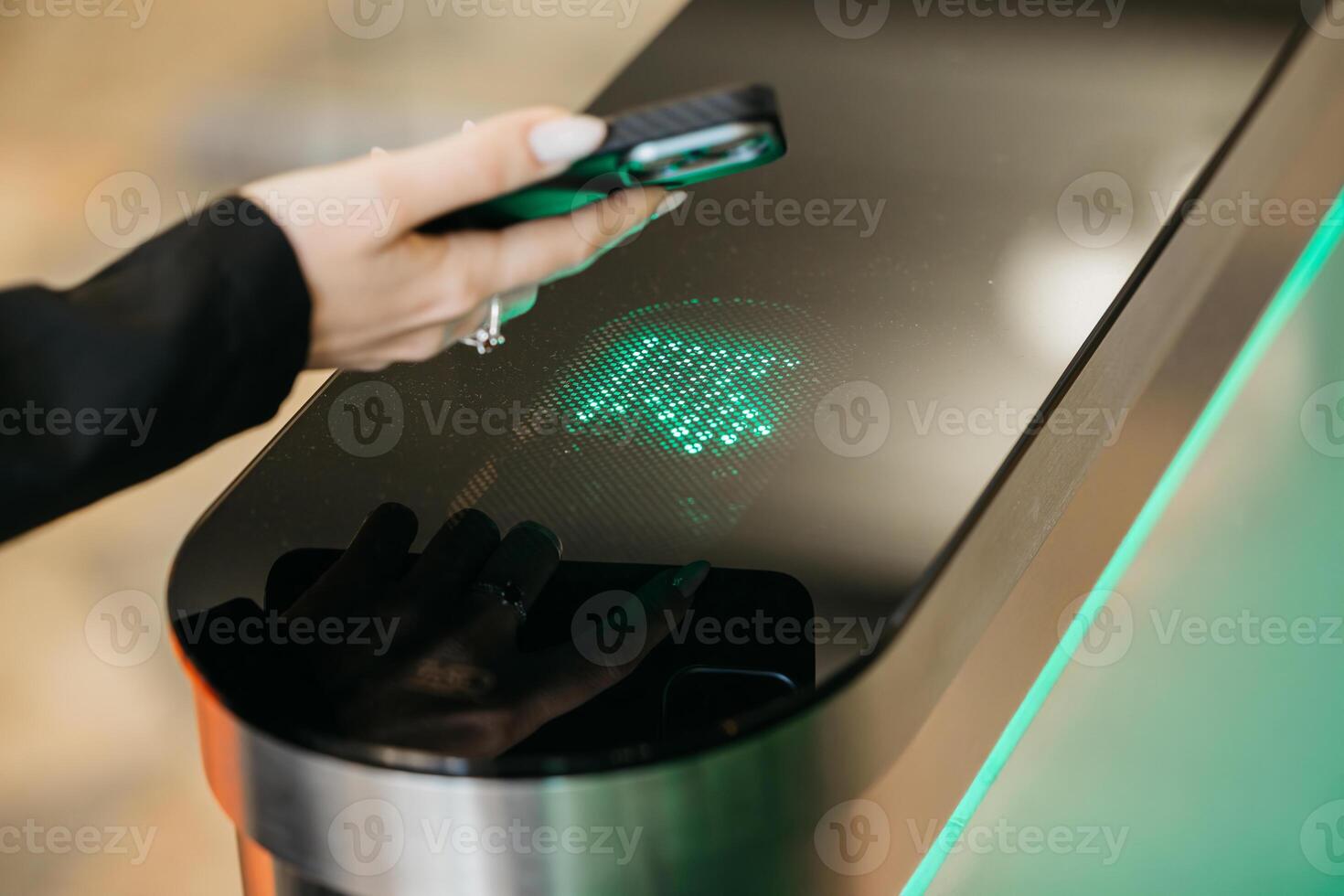 Hand of a woman using smartphone to interact with a modern biometric scanner, showcasing advanced technology and security features in a sleek environment with illuminated design elements Pro Photo