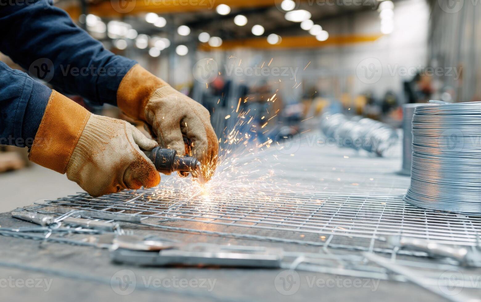 Hands welding galvanized steel mesh fence panels in a workshop setting demonstrating skilled craftsmanship and precision work Pro Photo