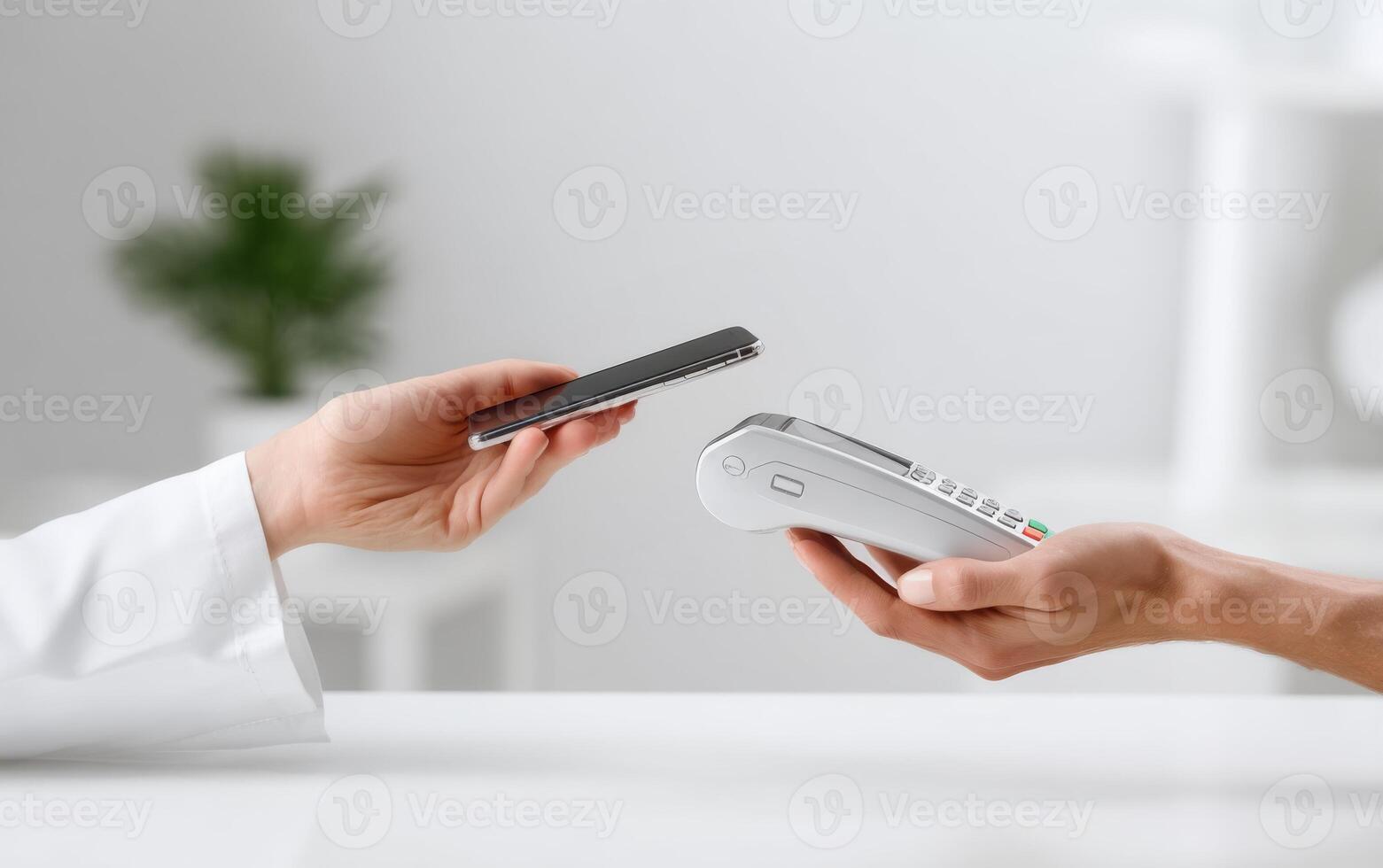 Person using smartphone to interact with a payment terminal in a bright, modern setting Pro Photo
