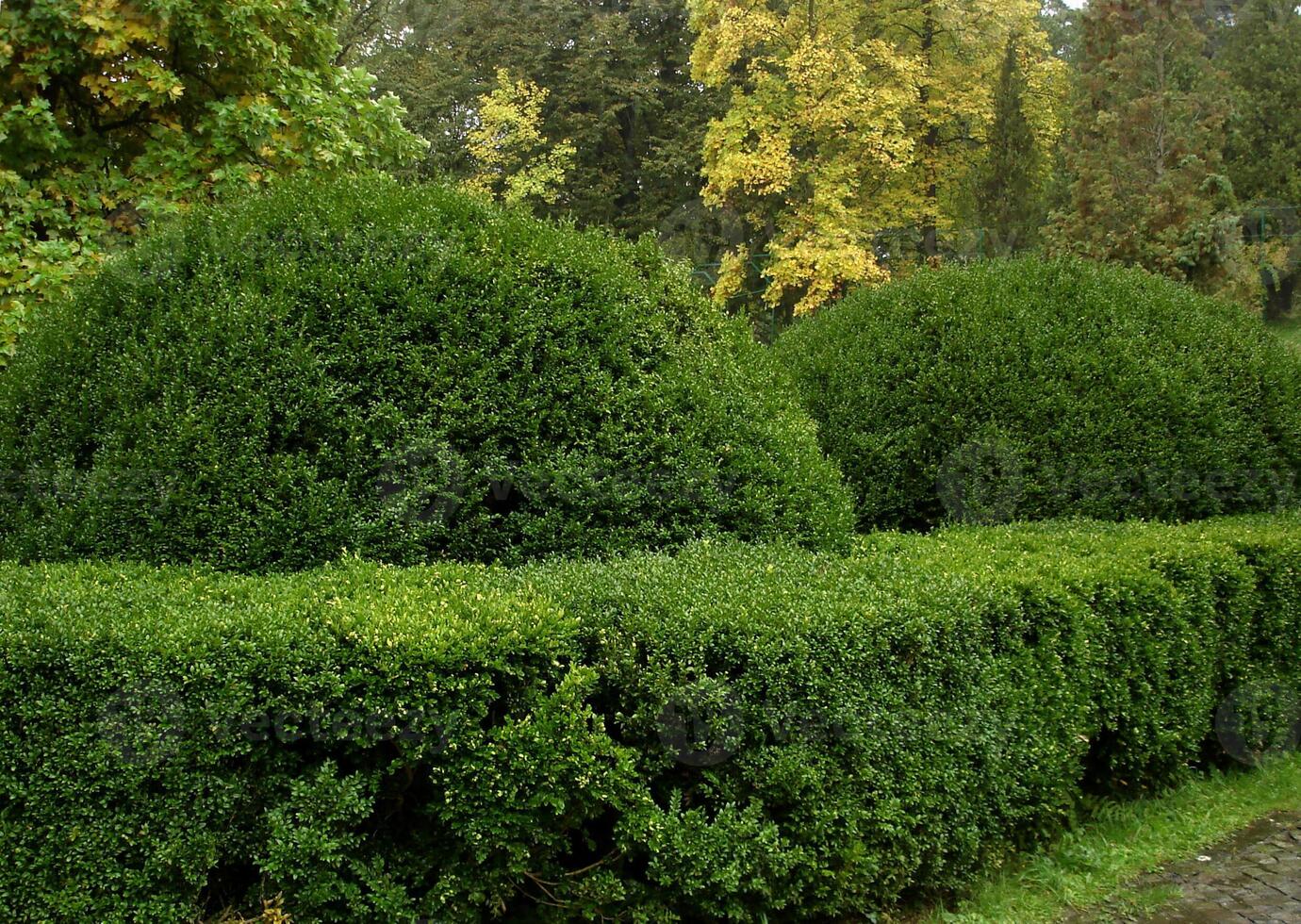 Spherical bushes in the park for two consecutive along the hedges. Greenery and trees in autumn in the rain Pro Photo