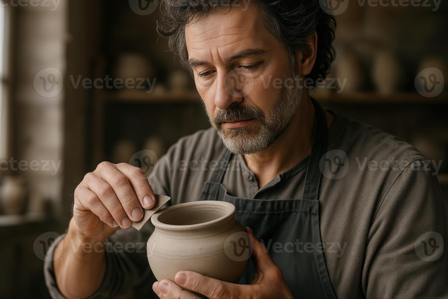 A Skilled Artisan Crafting Pottery in a Rustic Studio with a Focused Expression, Creating a Handmade Ceramic Pot with Precision and Care Pro Photo