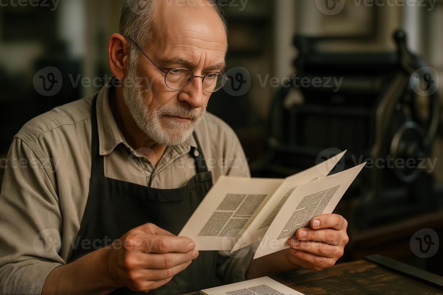 Elderly man engaged in traditional printing techniques, examining printed pages with deep concentration in a workshop setting Pro Photo