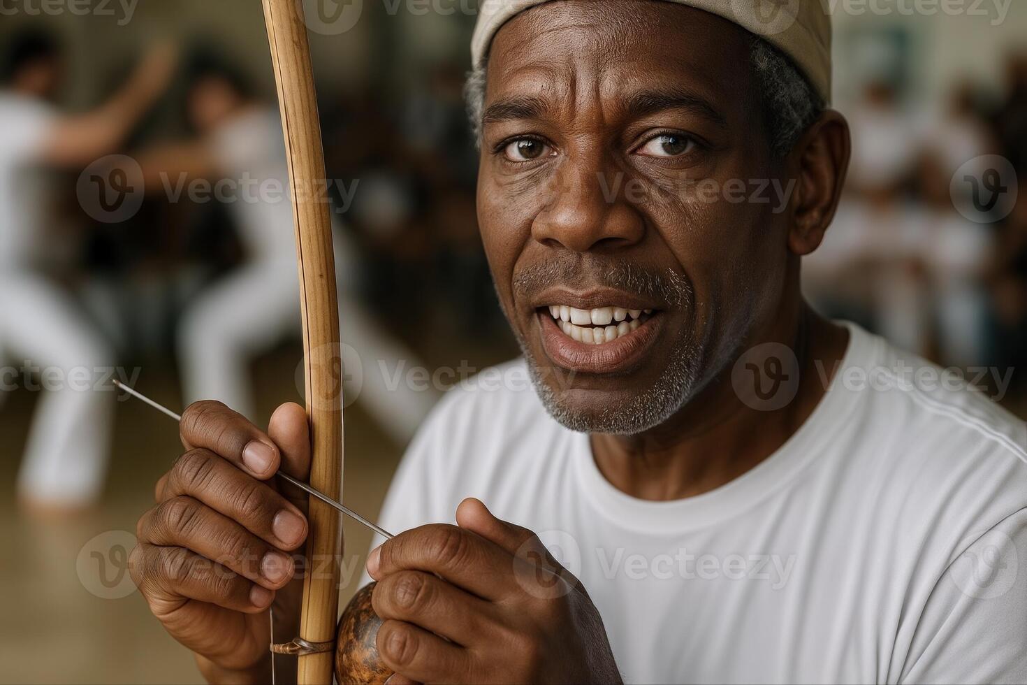 Capoeira Mestre Playing Berimbau in an Indoor Roda Setting with Focus on Expression and Cultural Context With Shallow Depth Of Field Pro Photo