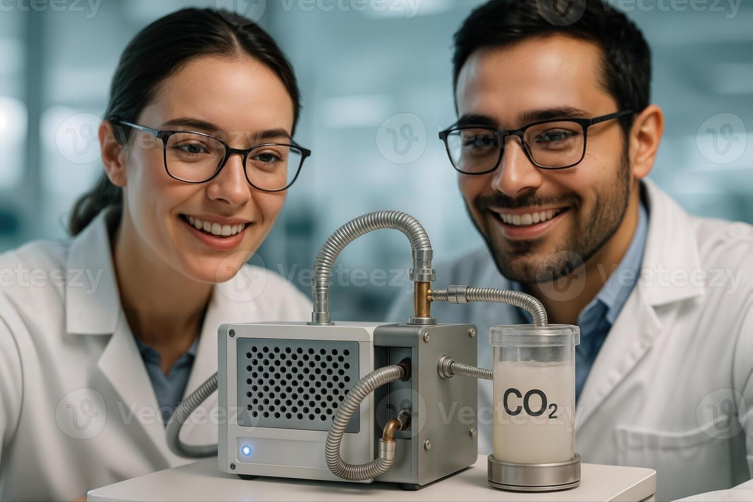 Innovative Carbon Capture Technology Demonstration in a Laboratory Setting with Two Scientists Observing a Device for CO2 Extraction Pro Photo