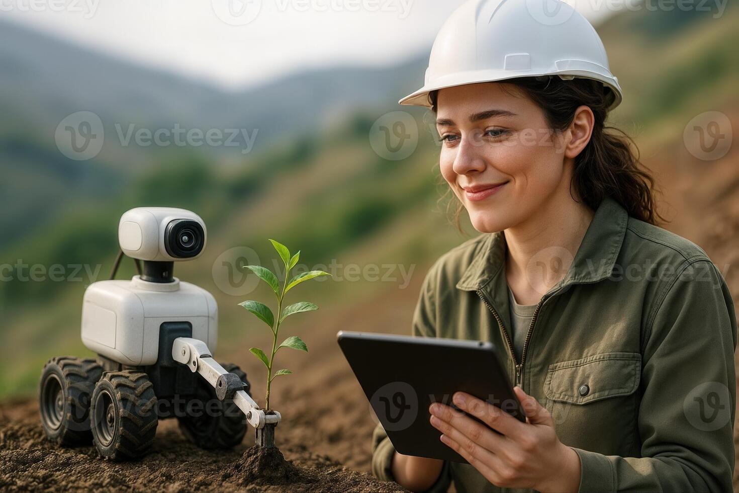 A Robot Planting Trees Outdoors With A Woman Observing And Using A Tablet, Capturing A Scene Of Modern Environmental Technology In Action During Daylight Pro Photo