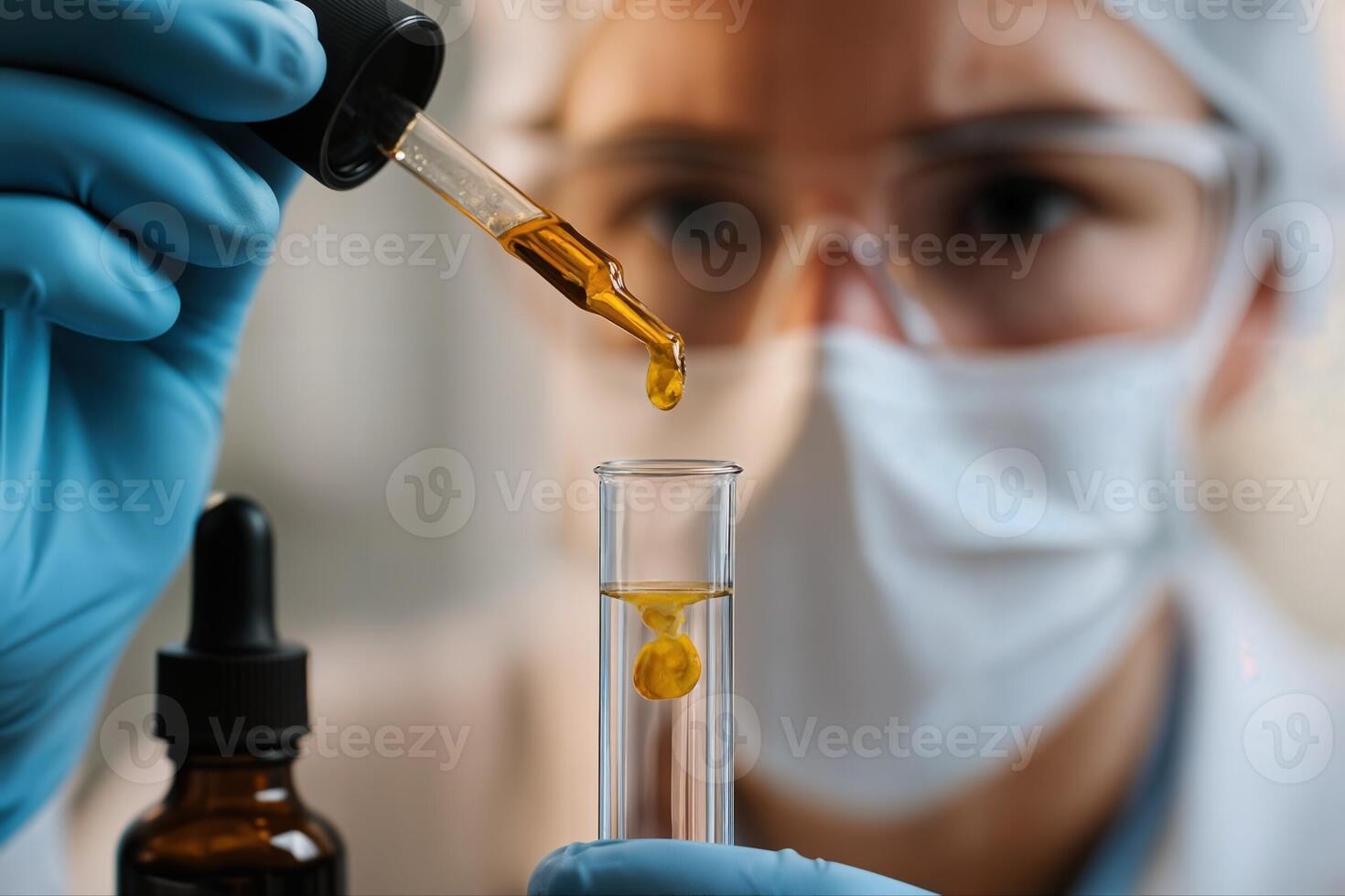 Cannabis Oil Experimentation in a Laboratory Setting Featuring a Scientist Carefully Handling a Dropper and Test Tube with Focused Expression and Gloves Pro Photo