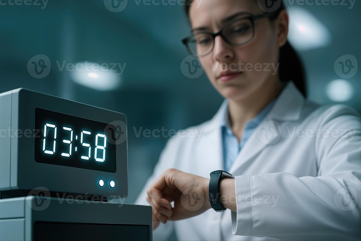 Laboratory Countdown with a Scientist in Focus, Indoors with a Clear View of the Timer Display, Capturing a Moment of Precision and Anticipation Pro Photo