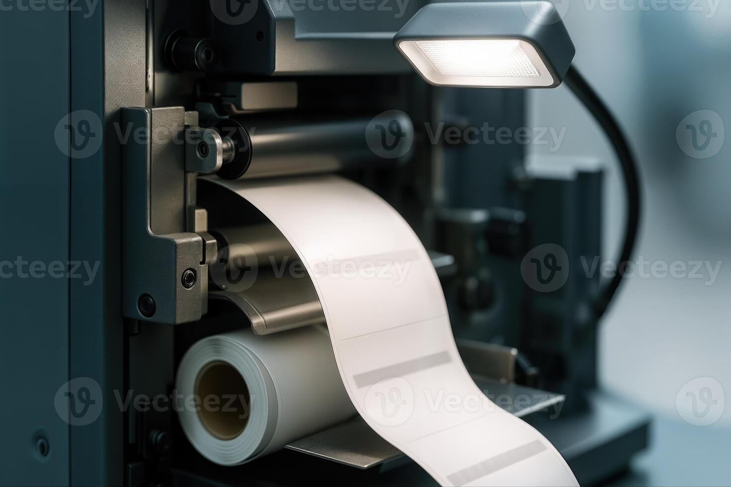 Label Printing Machine In Action With Long Roll Of White Labels In A Well Lit Workspace Setting Emphasizing Modern Industrial Technology Pro Photo
