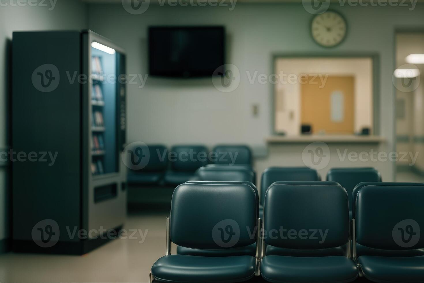 Hospital Waiting Area With Empty Seats Next To Vending Machine And Television Under Soft Lighting In An Indoor Setting Leading To A Reception Desk Pro Photo