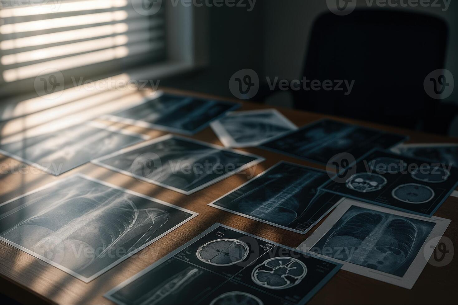 Medical X Rays Spread Across a Wooden Table in a Sunlit Room with Shadows Casting a Pattern from the Window Blinds, Creating a Dramatic and Insightful Scene Pro Photo