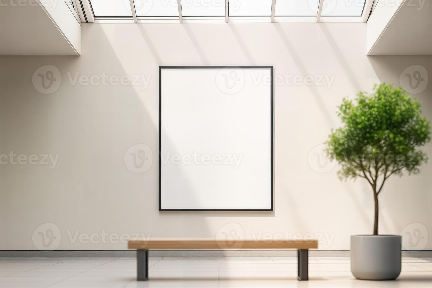 Atrium Poster Showcase Featuring a Blank Frame on a Sunlit Wall with a Minimalist Bench and a Potted Tree in a Bright Open Space Pro Photo