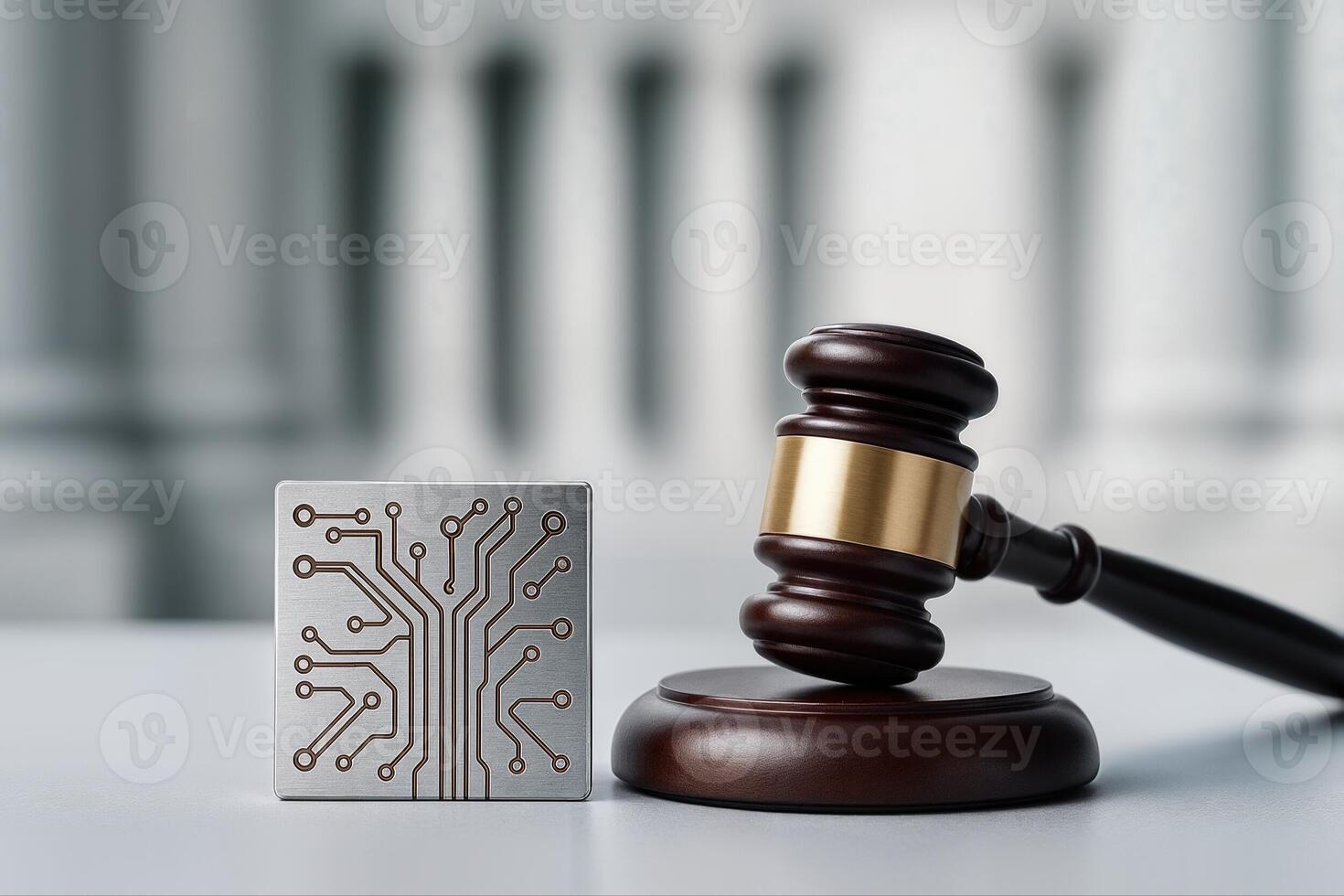 Legal Tech Concept Featuring A Wooden Gavel And Metallic Circuitry On A Tabletop With Blurred Background, Symbolizing The Intersection Of Law And Technology Pro Photo