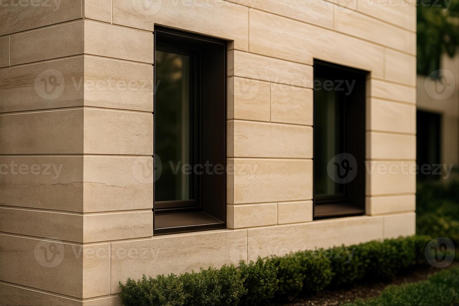 Elegant Limestone Facade of a Building with Rectangular Windows and Geometric Patterns in Natural Light, Surrounded by Neatly Trimmed Greenery Pro Photo