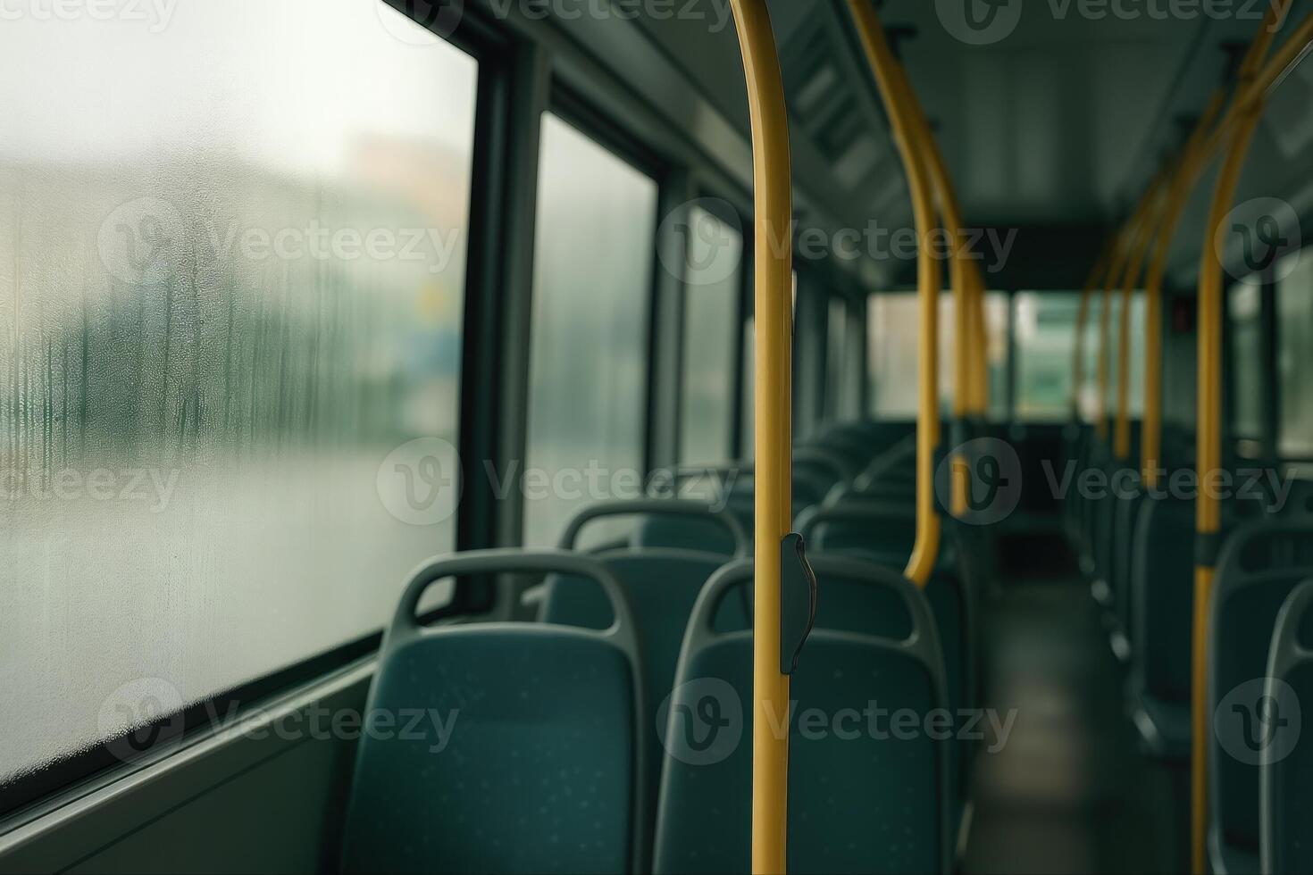 Interior Of An Empty Bus Showing Rows Of Seats And Yellow Handrails On A Rainy Day With Foggy Windows Creating A Quiet And Calm Atmosphere Pro Photo