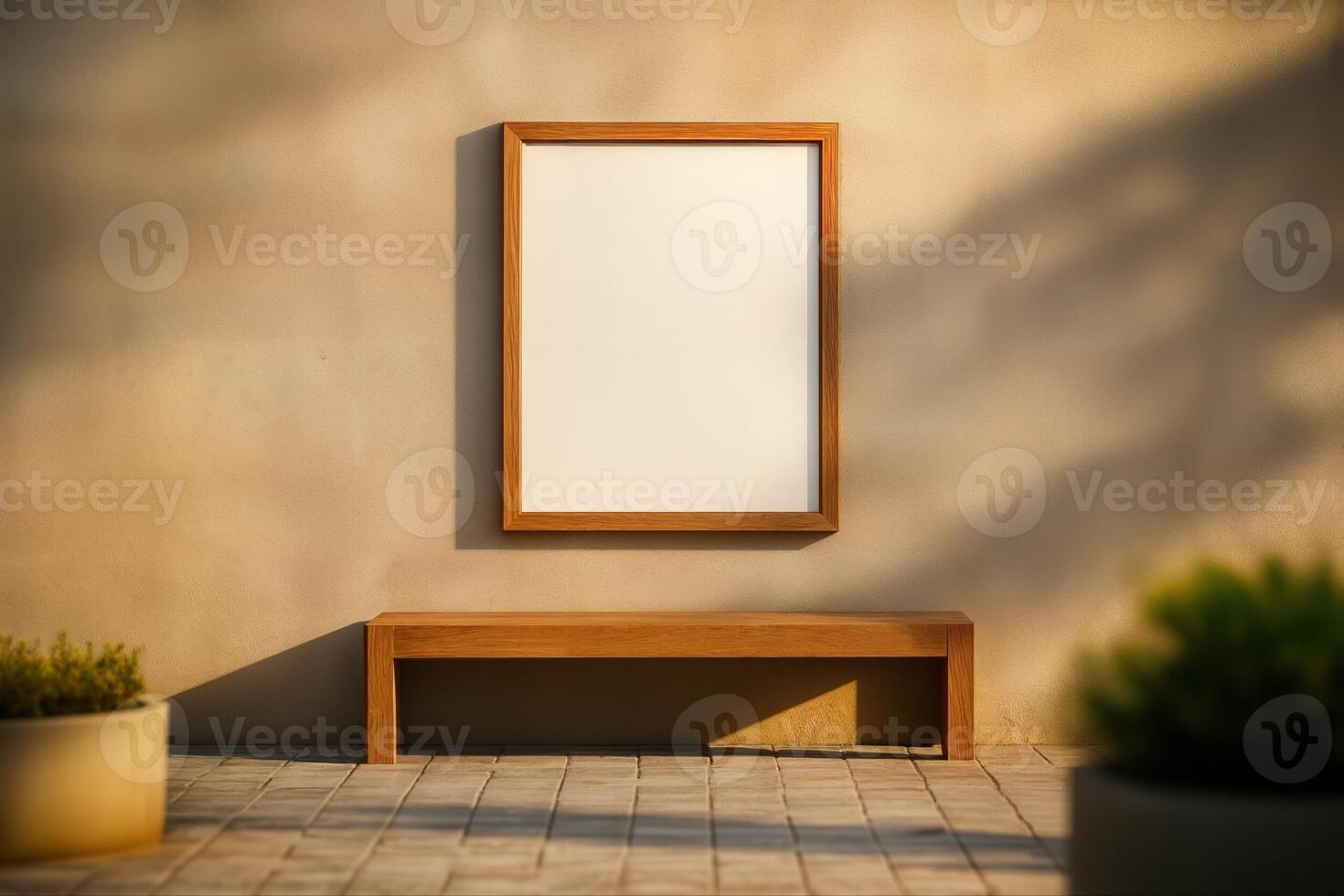 Courtyard With an Empty Wooden Frame on a Sunny Afternoon Featuring Minimalist Warm Tones and Shadows Casting Over the Tiled Floor and Plant in Foreground Pro Photo