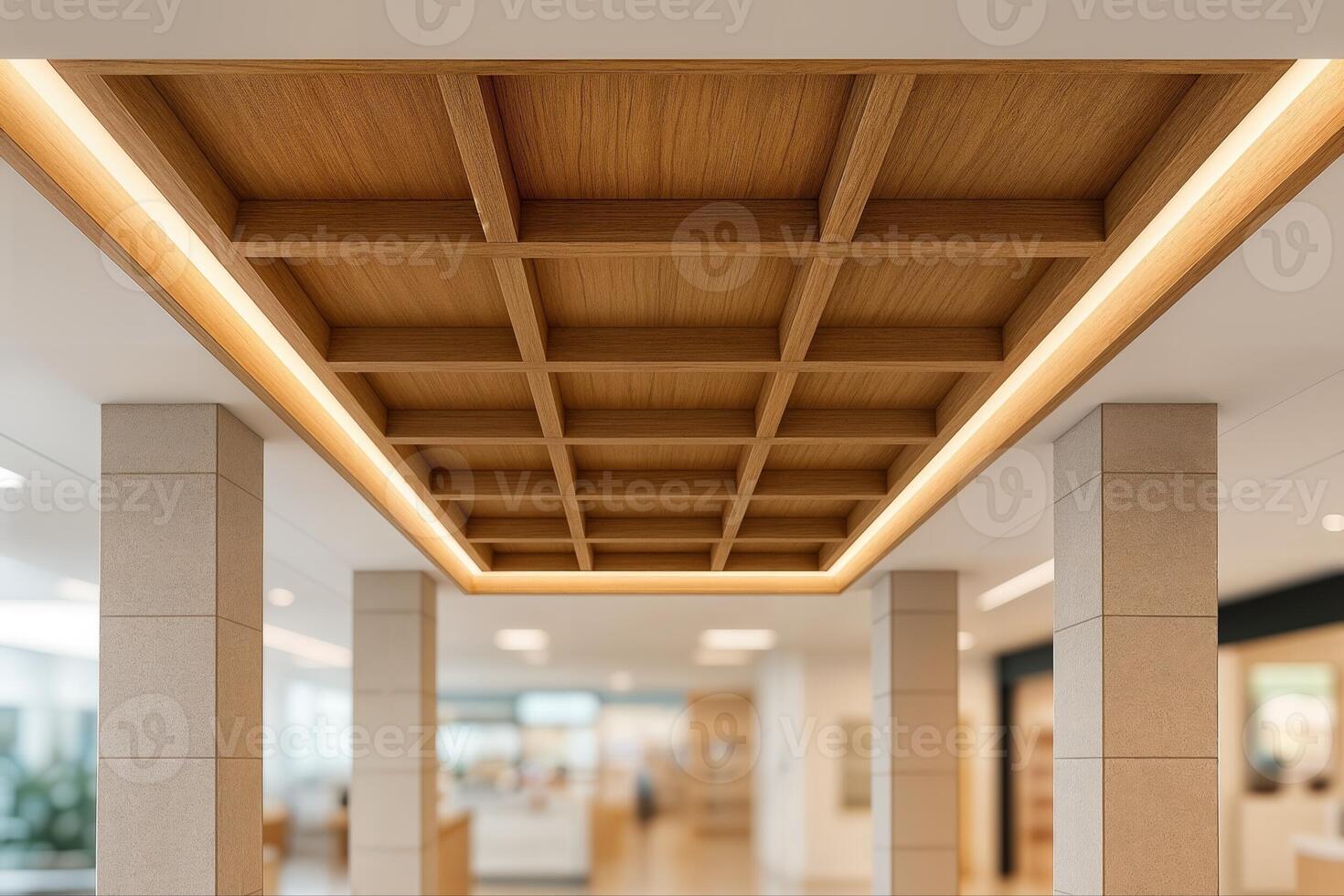 Timber Coffered Ceiling in a Modern Interior Space with Columns and Soft Ambient Lighting Featuring Symmetrical Lines and Warm Tones Pro Photo