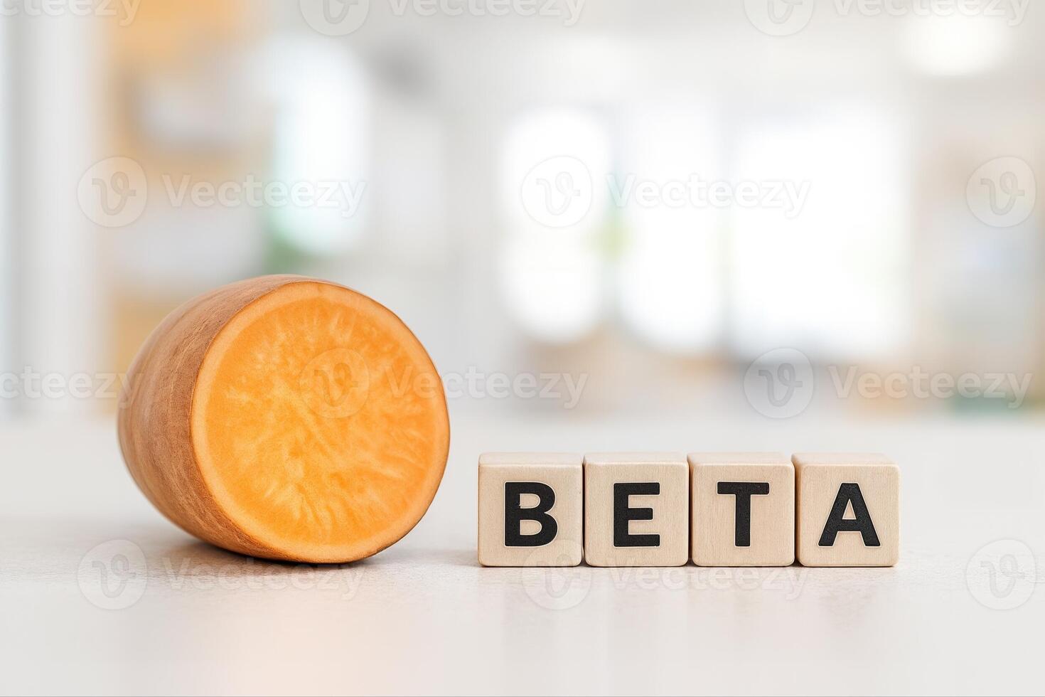 Sweet Potato Beside Block Letters Spelling Beta on a Minimalist White Surface with Soft Focus Background and Natural Light Pro Photo