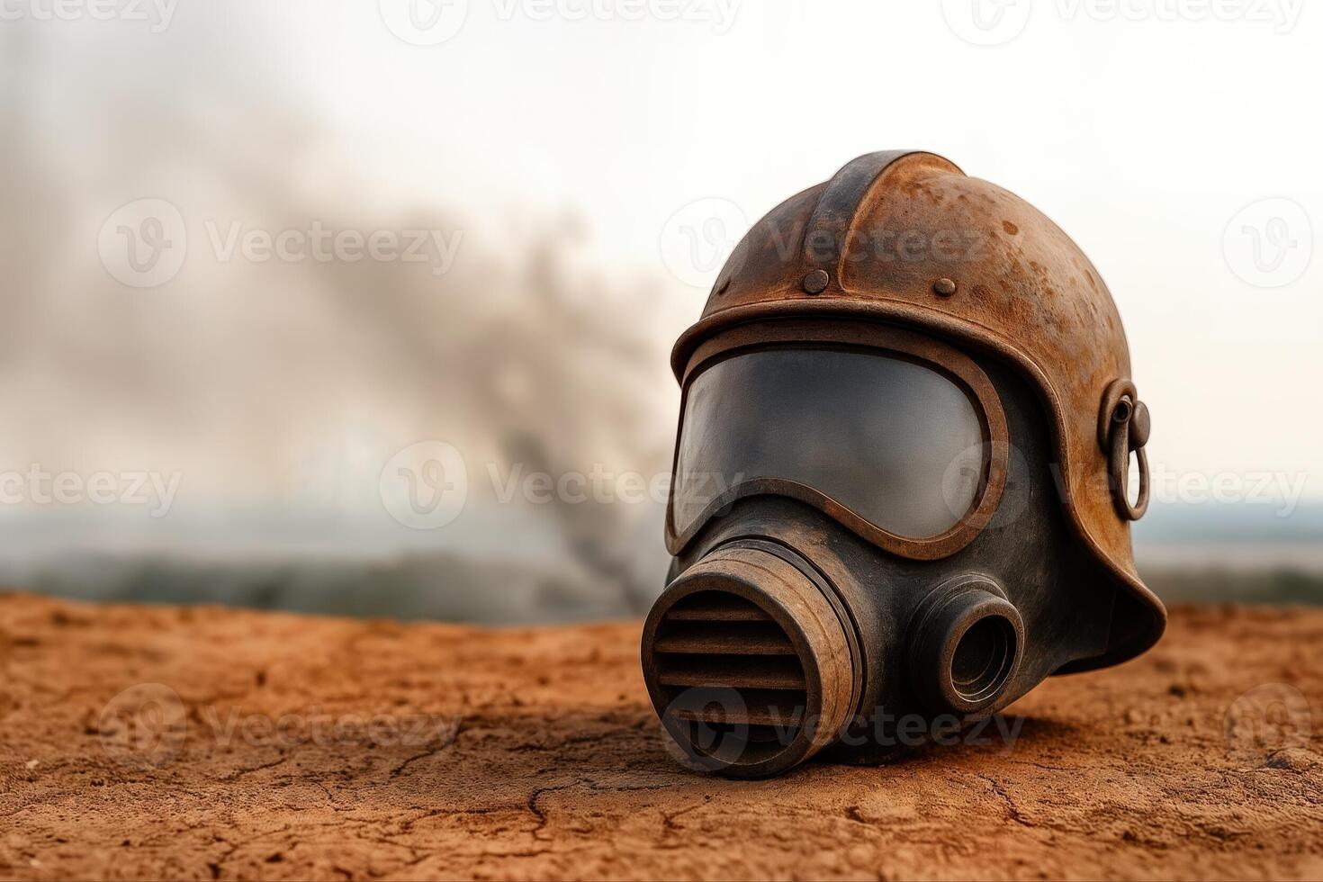 A Rusty Gas Mask Lying on Barren Soil with Smoke Filling the Background, Suggesting a Post Apocalyptic Setting in Natural Light Pro Photo