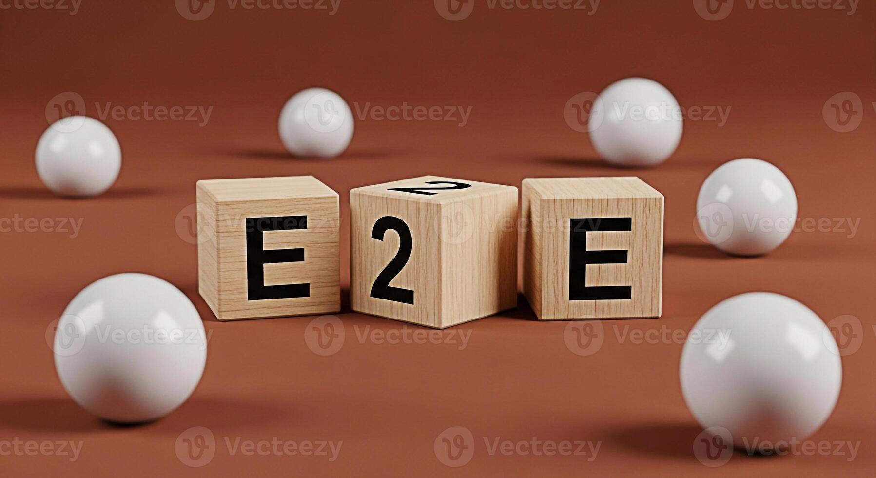 Wooden blocks spelling E2E on a brown surface surrounded by white spheres representing endtoend encryption and secure communication in a minimalist and modern setting conveying trust and reliability Pro Photo