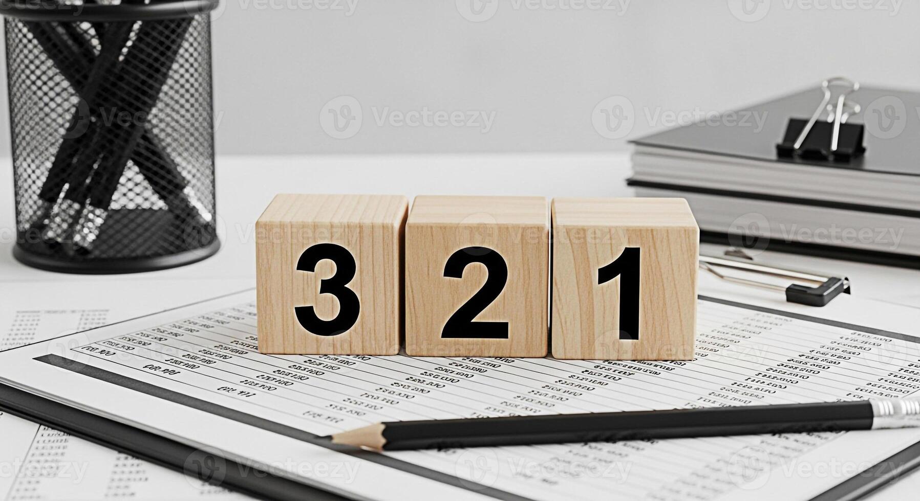 Wooden number blocks displaying 321 on a financial spreadsheet in a bright office setting symbolizing countdown planning and achieving goals with precision and focus Pro Photo