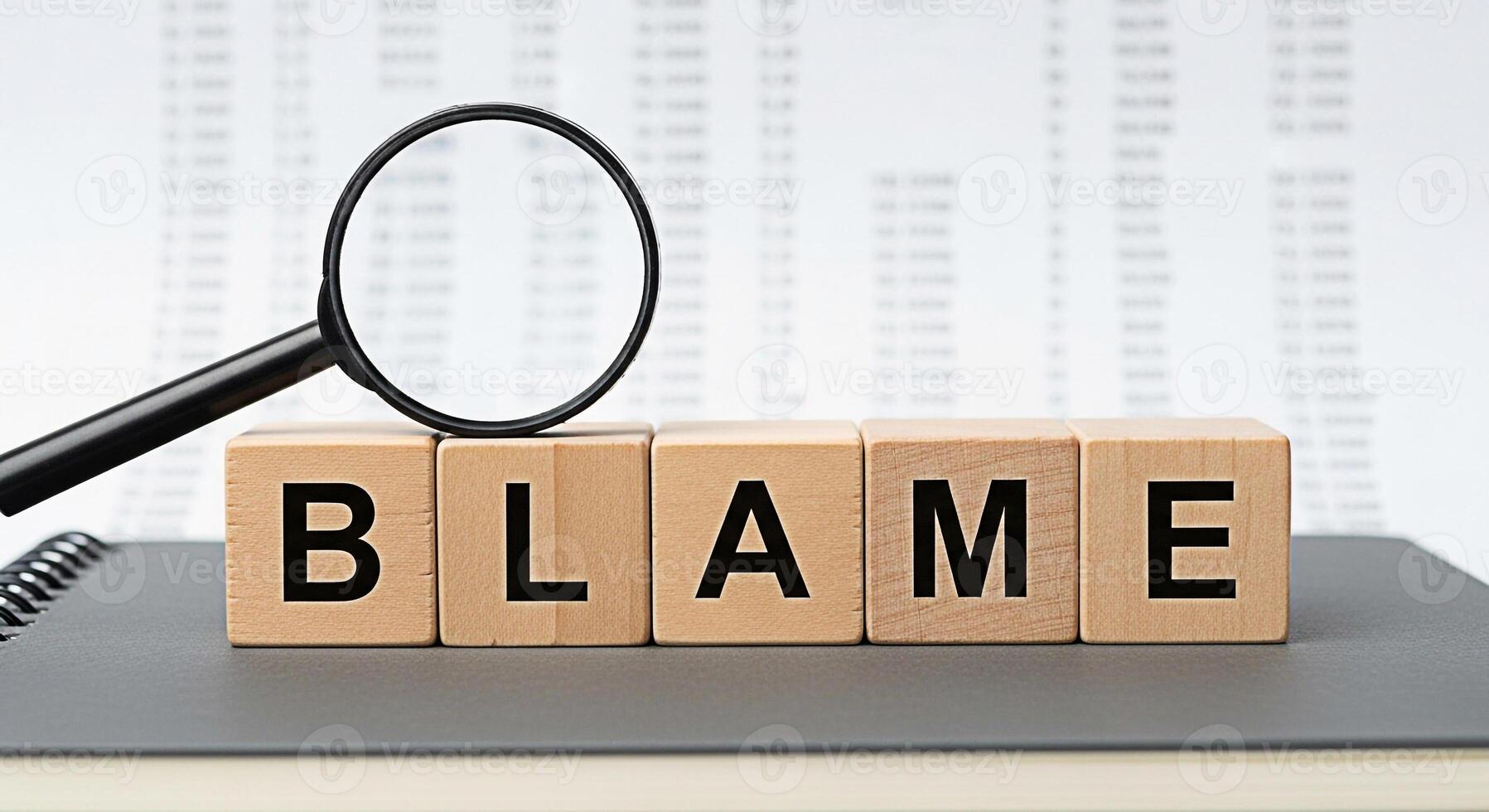 Magnifying glass inspecting wooden blocks spelling BLAME on a notebook with a financial report background symbolizing accountability and responsibility in a corporate environment creating a serious an Pro Photo