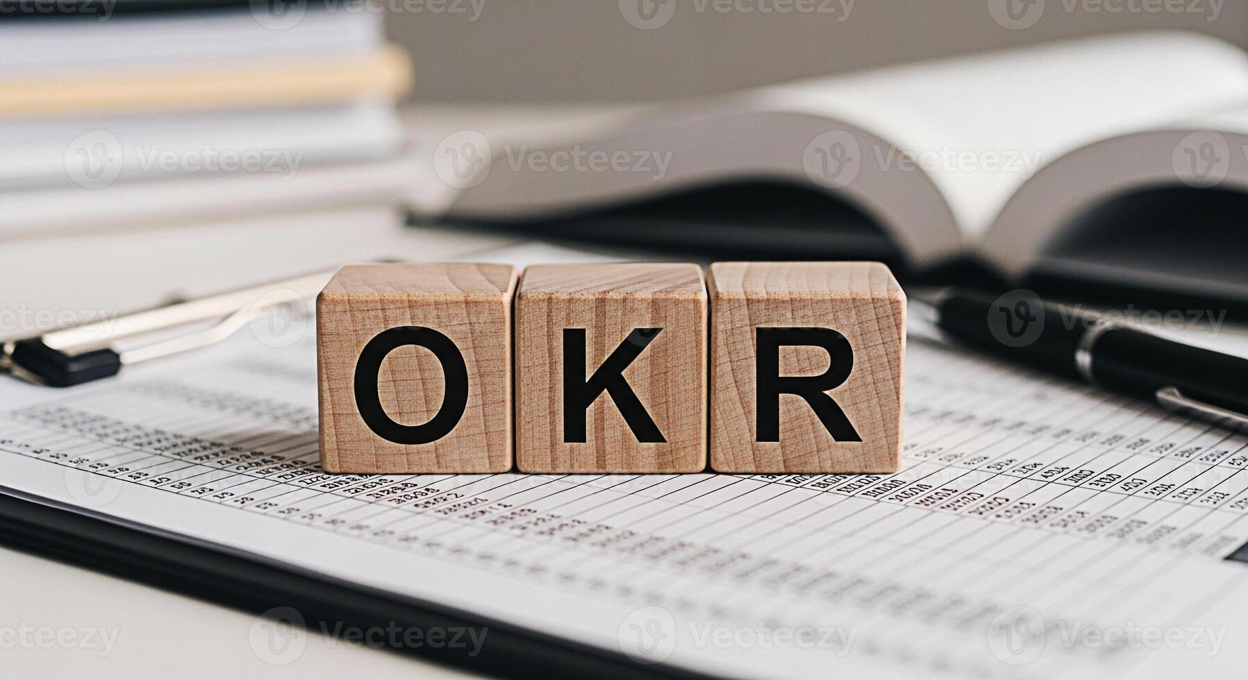 Wooden blocks displaying OKR on a financial report in a bright office representing objectives and key results for business strategy and goal setting creating a focused and organized work environment Pro Photo
