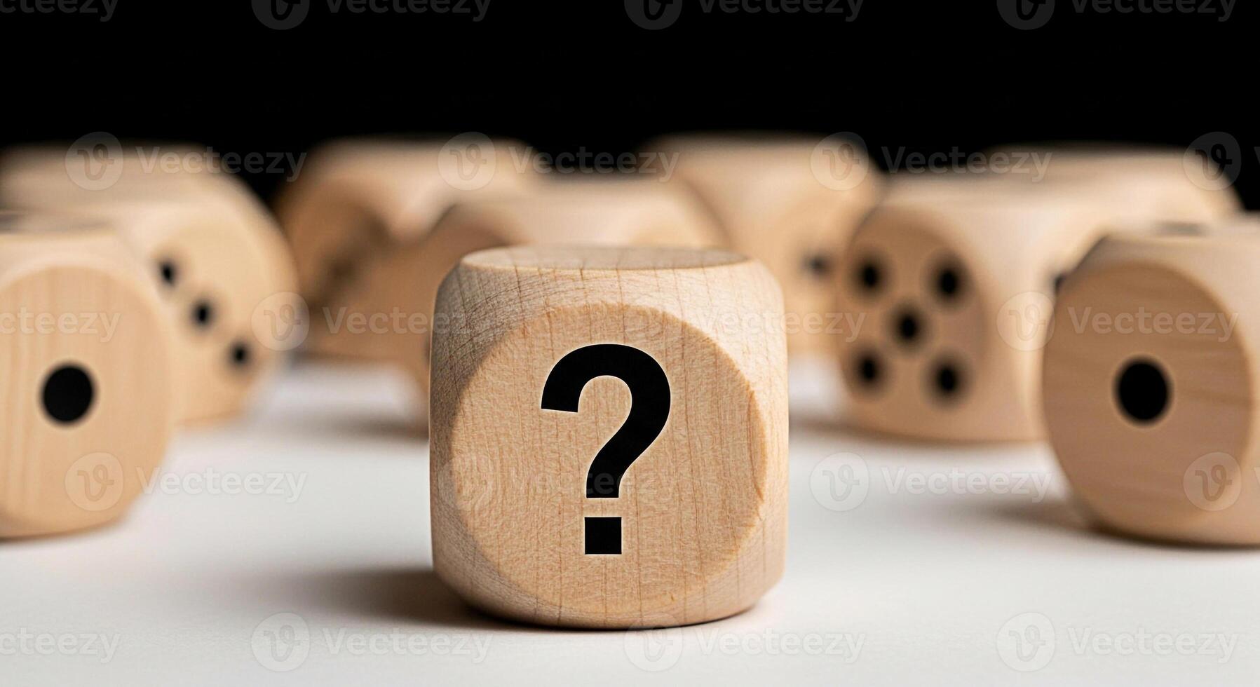 Wooden dice displaying a question mark on a white surface surrounded by other dice representing uncertainty and the need for decisionmaking in a complex and ambiguous situation Pro Photo