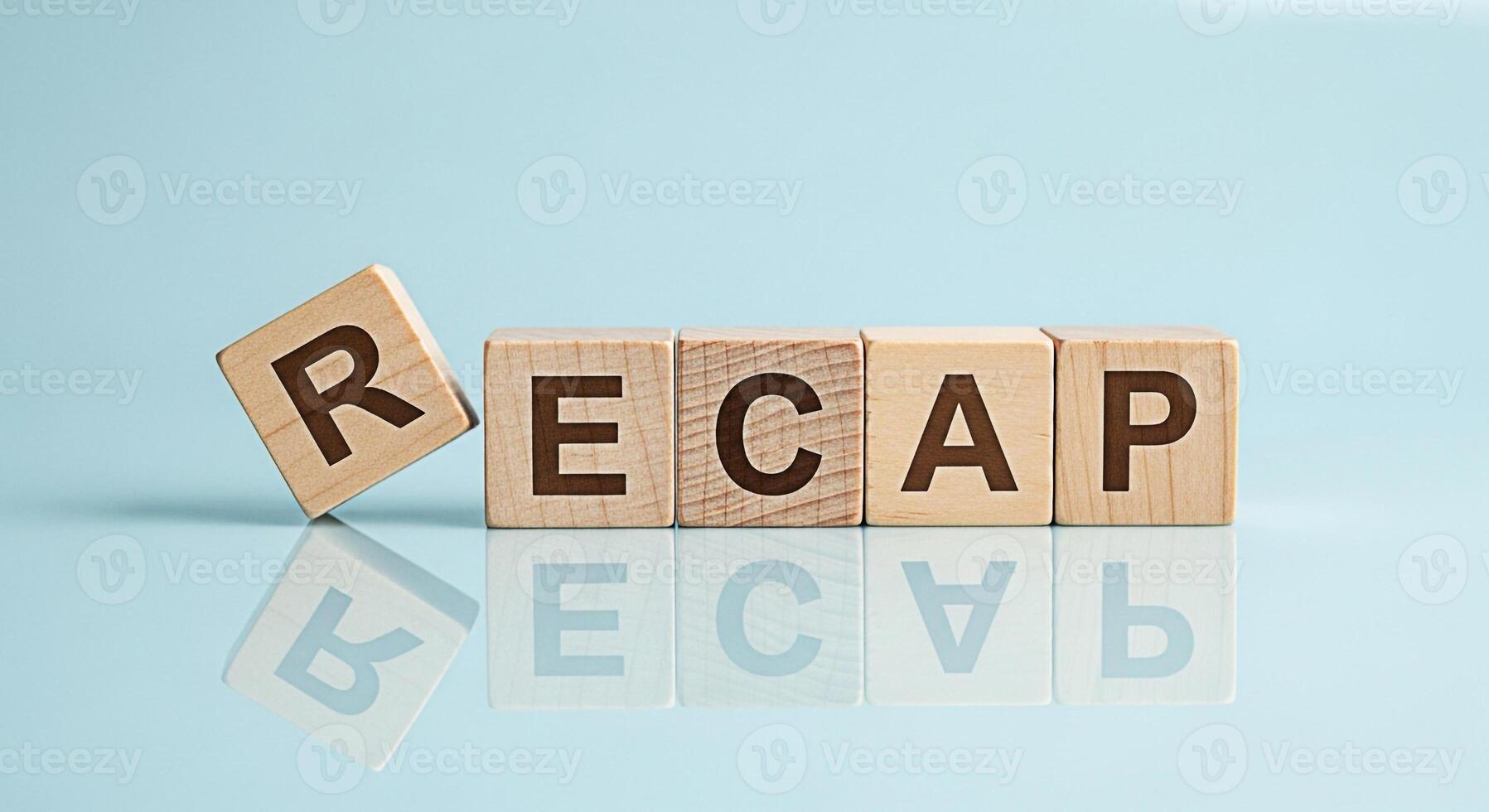 Wooden blocks spelling RECAP on a reflective surface against a light blue background symbolizing review and summary perfect for business presentations and endofyear reports with a clean and modern aes Pro Photo