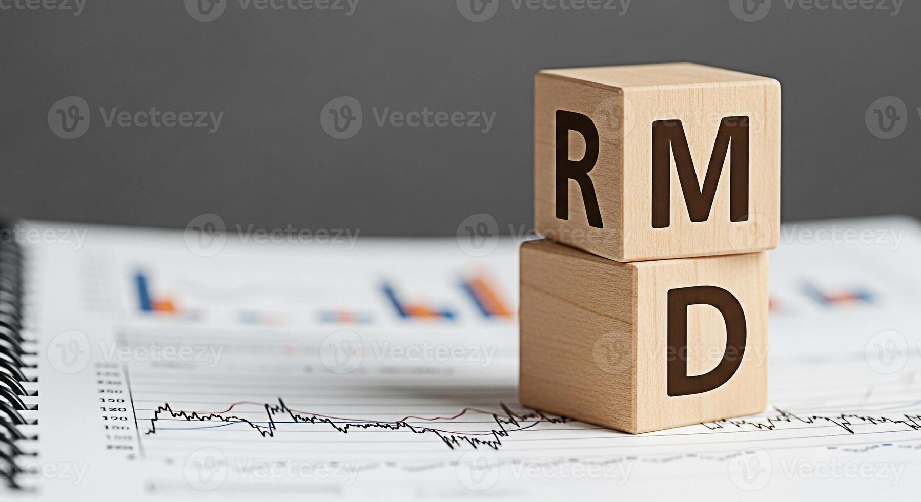 Wooden blocks displaying RMD resting on a financial chart in a corporate setting symbolizing risk management and data analysis for strategic decisionmaking and investment planning Pro Photo