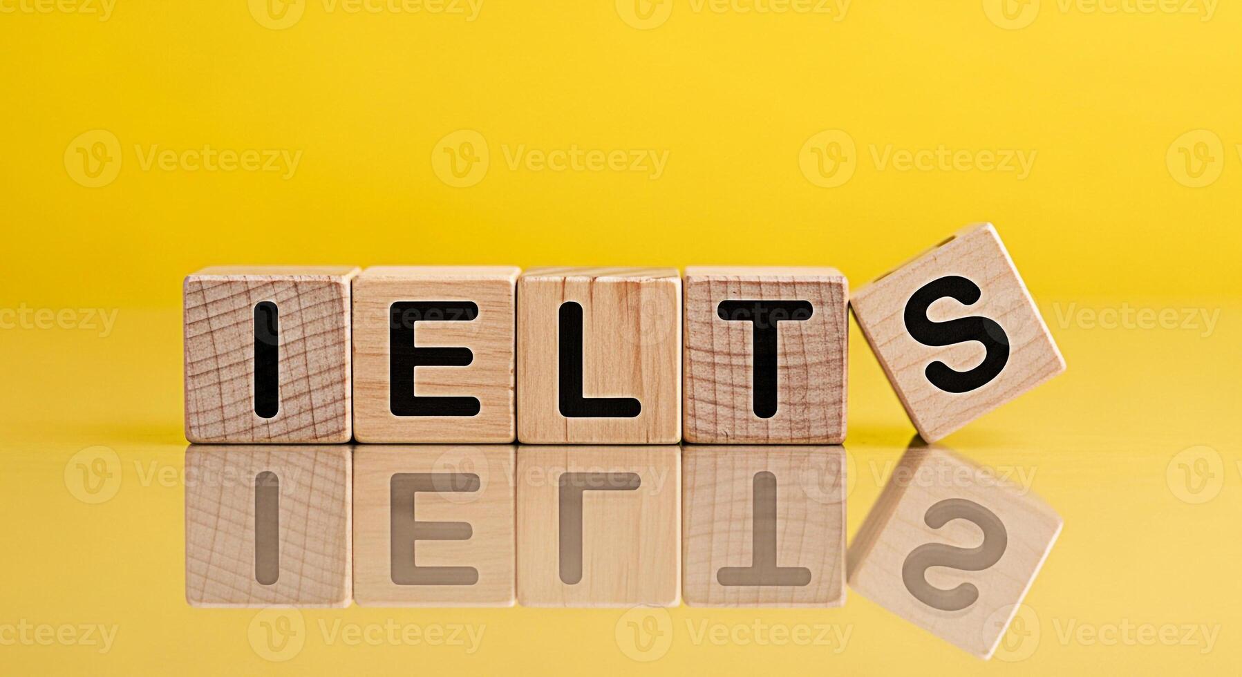 Wooden blocks spelling IELTS on a yellow reflective surface symbolizing preparation and success in the International English Language Testing System exam creating a bright and optimistic atmosphere fo Pro Photo