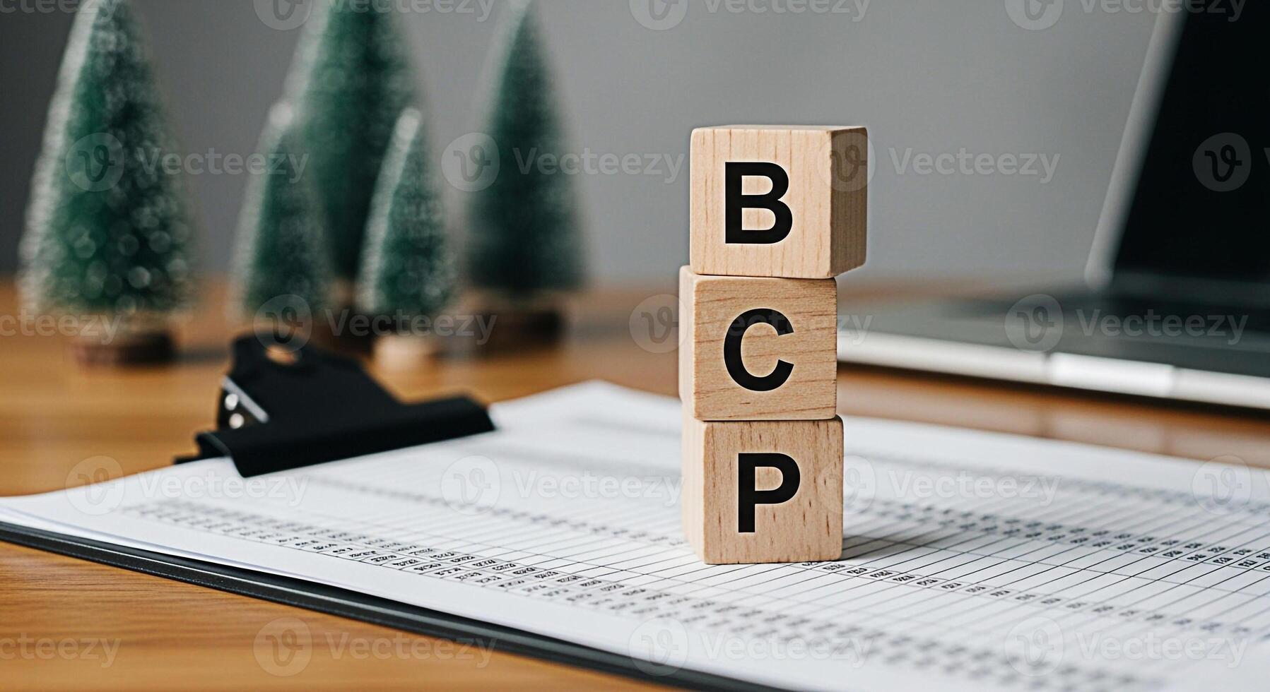 Wooden blocks spelling BCP stacked on a clipboard with financial data in a modern office setting representing Business Continuity Planning and a proactive approach to risk management and disaster reco Pro Photo